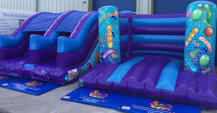 Bouncy Castle with a Separate Mini Inflatable Slide Hire. Bouncy castle party hire packages in Cheltenham, Gloucester, Tewkesbury, Cirencester, Stroud and Cotswold Villages, Gloucestershire....