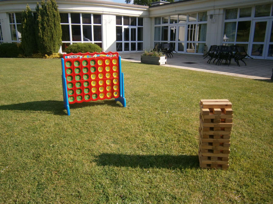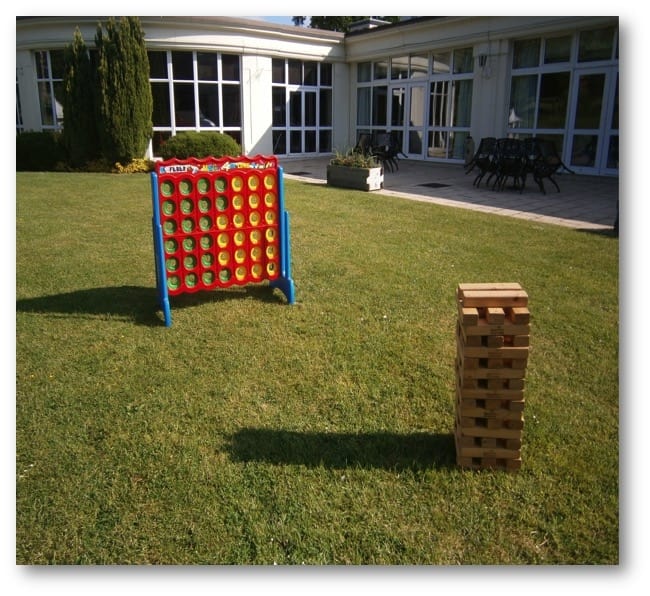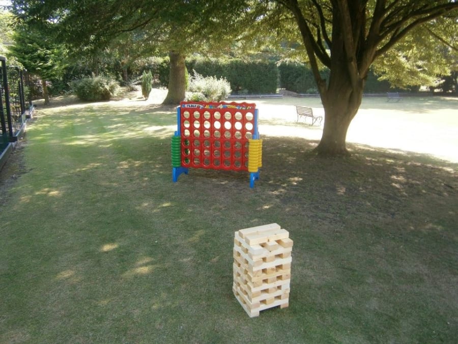 Giant garden lawn games to hire. Giant jenga is one of many giant garden games to hire for your wedding day, kids bouncy castle birthday party or company event. Call Gloucestershire entertainment and event hire company All about fun uk.com ~ the party and event company on 01242 235273.