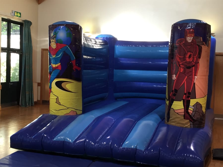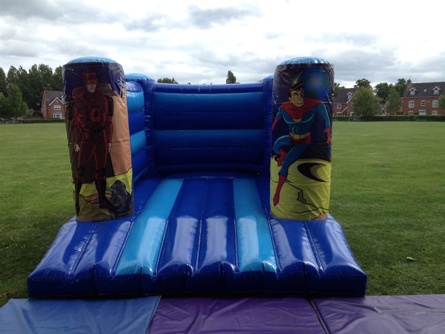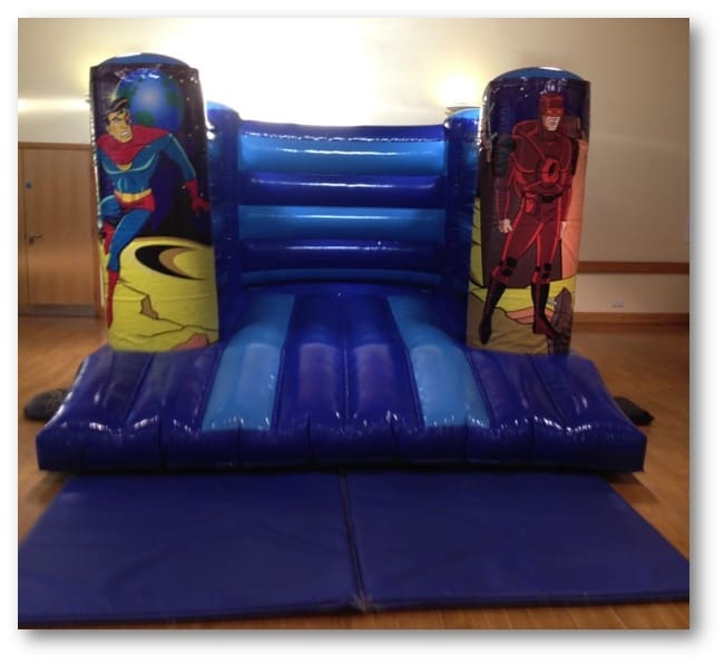 Super hero bouncy castle for hire. Your super heroes will be in for a treat when you hire this awesome super hero themed bouncy castle. This 12ft by 15ft super hero themed bouncy castle is just an ideal bouncy castle hire choice for any little superhero or heroine and with two digitally printed cyber super hero characters they will be in safe hands as they go on a super hero quest to save the day.