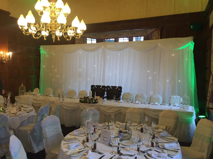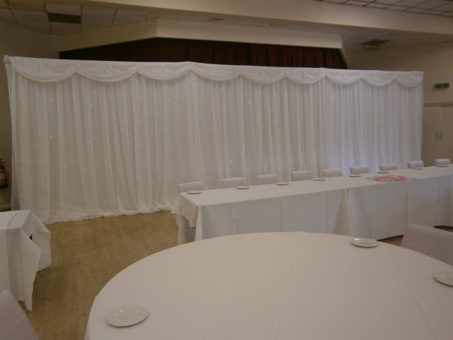 Our luxurious white starlight back drop can stand at an impressive 9 metres by 3 metres. It is totally free standing using a telescopic pole and base system which makes it fully mobile and also adjustable to the size that you require.