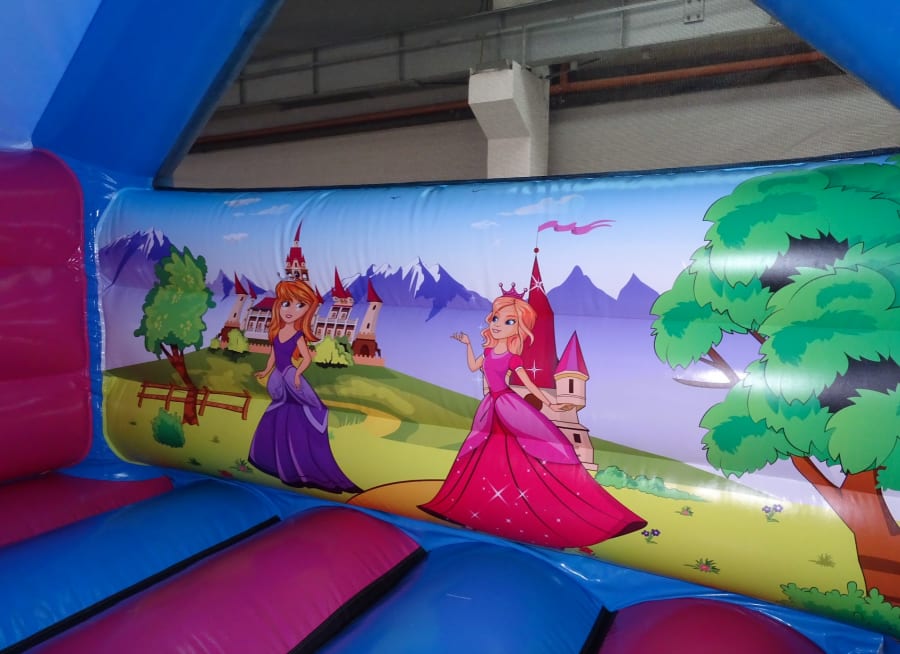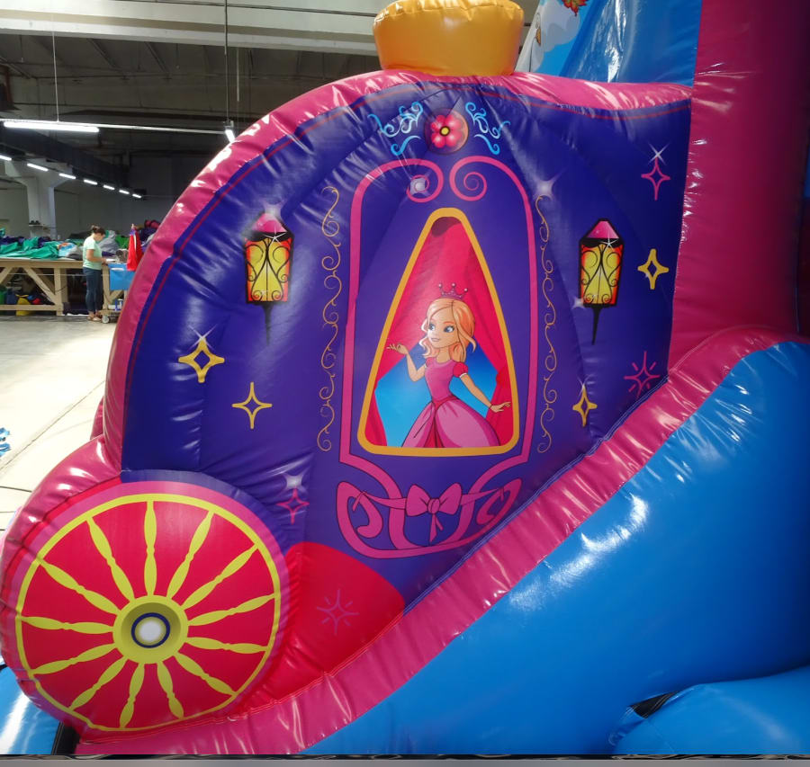 The 3D princess carriage activity combi castle has a bouncy castle bed and front slide shaped as princess carriage. The princess 3D carriage comes in vibrant shiny princess themed artwork and is a perfect castle combi slide for princesses who just love to bounce and slide and who also want to stand out from the crowd.