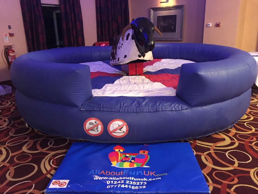 Hire a bucking bronco rodeo bull in Gloucestershire, Cheltenham, Gloucester, Tewkesbury, Gloucester and surrounding areas. For the best rodeo bull party call All about fun uk.com ~ the party and event hire company on 01242 235273.