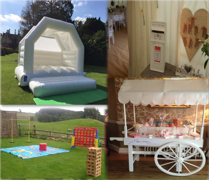 White Wedding Bouncy Castle, 4 Giant Garden Games, Candy Cart & Replica Post Box Hire.