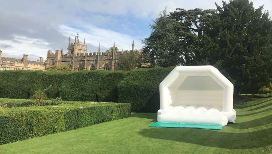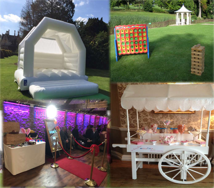 White Wedding Bouncy Castle, 2 Giant Garden Games, Candy Cart & Magic Selfie Mirror Games Package.